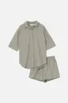 Виготовлений із легкої суміші бавовни та льону, цей комплект огортає вас відчуттям спокою завдяки приглушеному зеленому відтінку, що випромінює природну елегантність.