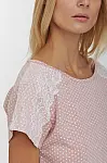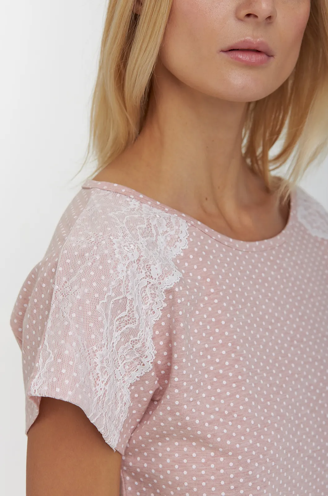 Модель у персиковому кольорі з білим горохом, прикрашена витонченим мереживом на плечах, що додає образу жіночності та легкості. Натуральна бавовняна тканина приємна до тіла, дихає та забезпечує максимальний комфорт у будь-яку пору року.
