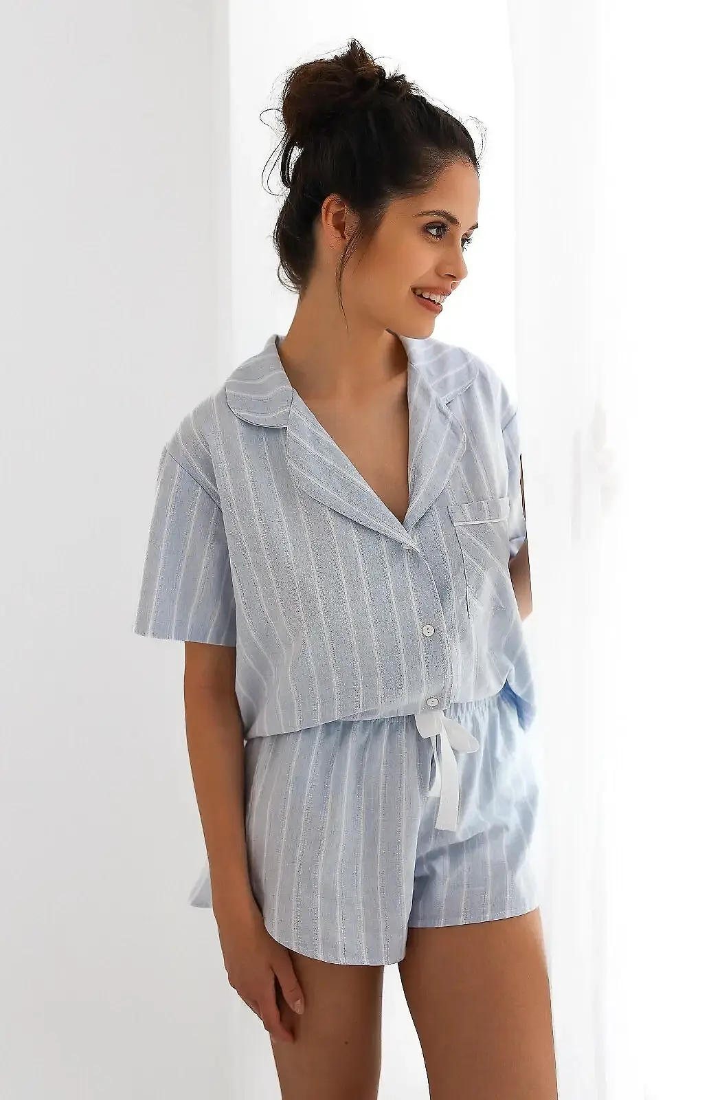 У комплект входять короткі шорти, які забезпечують додатковий комфорт і легкість в носінні завдяки зав'язкам. Весь комплект оздоблений модним синім меланжем у смужку, ідеально підходить для літніх вечорів. Жіноча піжама Alicia - ідеальний вибір для жінок, які шукають унікальне поєднання комфорту та елегантності в затишку свого дому.