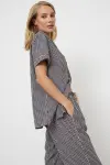 Короткорукавна сорочка на ґудзиках вирізняється елегантним закругленим V-подібним коміром і нагрудною кишенею, що додає шарму. Витончені карамельні кантові вставки уздовж коміра, нагрудної кишені та манжет рукавів надають кожному шву нотку розкоші.
