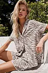Виготовлений із блискучої віскози у виразному кремово-коричневому зебровому принті, цей комплект створений для стильного та комфортного відпочинку.