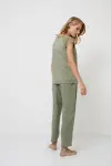 Штани довжиною до щиколоток виконані з м’якої віскози та доповнені регульованим бантом на талії, а також елегантним зеленим кантом. Їхній приглушений абстрактний візерунок у зелених тонах чудово гармонує з мереживними акцентами топа.
