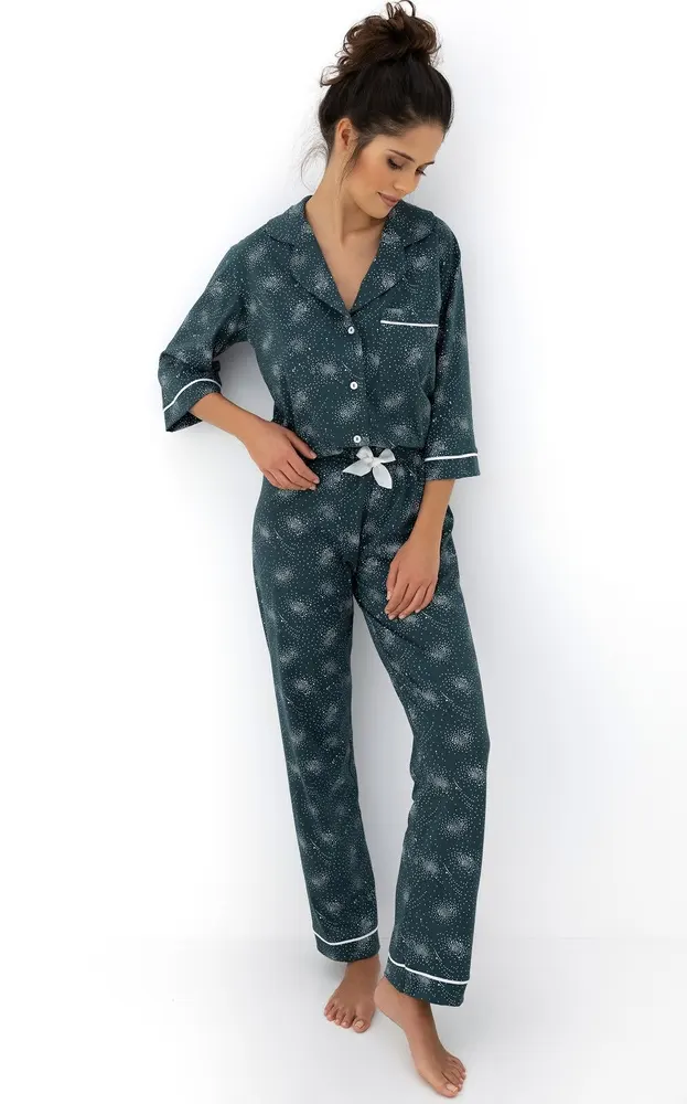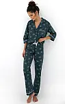 Модель виготовлена зі 100% натуральної бавовни, м’якої та приємної до тіла. Верх піжами виконаний у сорочковому стилі: рукав 3/4, класичний комір та застібка на ґудзики додають образу елегантності. Довгі штани мають еластичну гумку в поясі та декоровані витонченим сатиновим бантом, що підкреслює жіночність і забезпечує ідеальну посадку.
